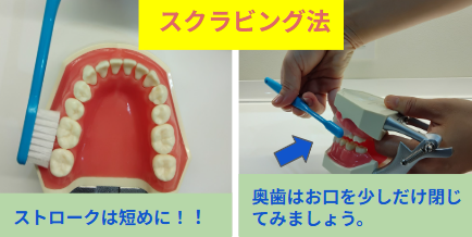 スクラビング法は、一般的な歯みがきの方法です。歯と歯ぐきの境目を意識して磨きましょう。また、奥歯はお口を閉じ気味にして磨くことで、歯ブラシが届きやすくなります。