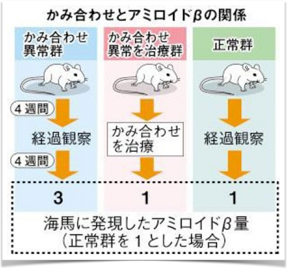 研究では、噛み合わせが悪い動物ほど、海馬にアミロイドβが多く蓄積することが示されています。