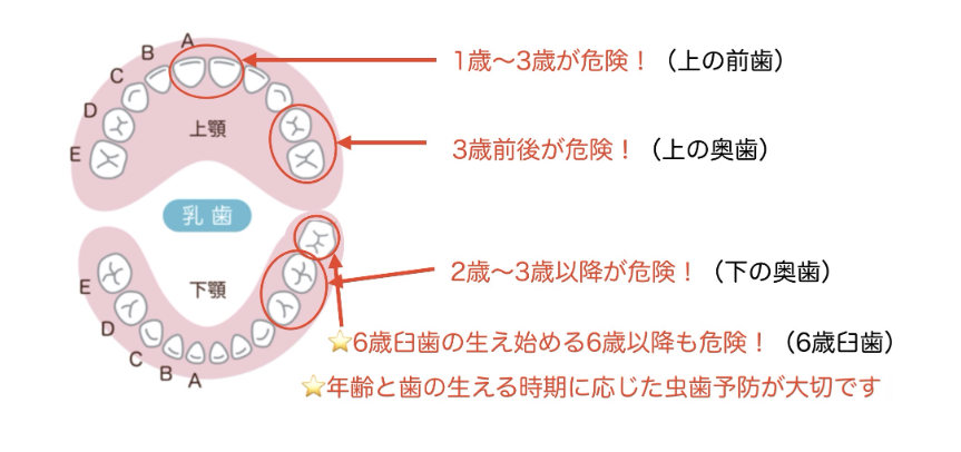 乳歯はエナメル質(歯の表面)が薄く、虫歯になりやすい特徴があります。食べかすが溜まりやすく、磨き残しが起こりやすいため、仕上げ磨きがとても重要です。特に以下の部分はリスクが高いと言われています。